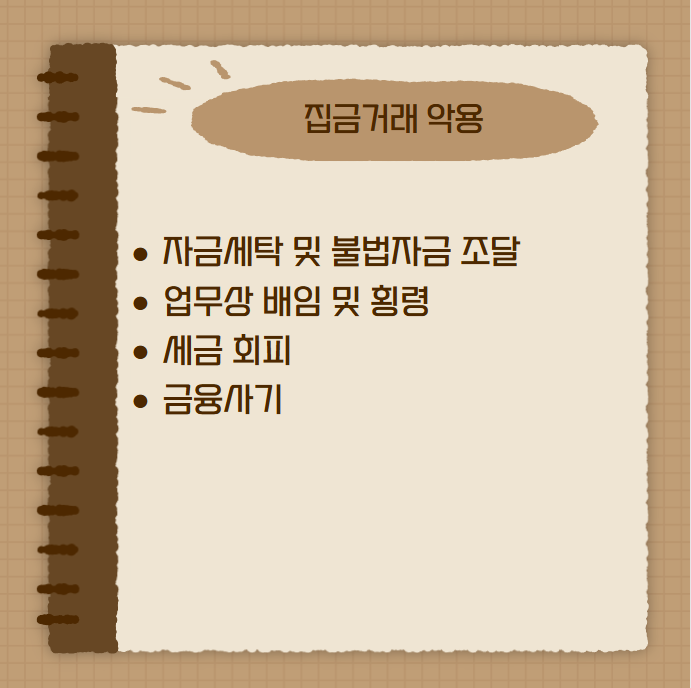 집금거래는 여러 계좌에서 돈이 들어와 누구의 돈이 어떻게 쓰이는지 알기 어렵기 때문에 자금세탁 및 불법자금 그리고 세금회피 용으로 쓰일 수 있습니다. 물론 투자 사기 피라미드 사기와 같은 금융 사기에도 사용될 수 있고요. 불법적인 활동이 의심될 경우 금융기관에서 계좌를 동결할 수도 있습니다.
