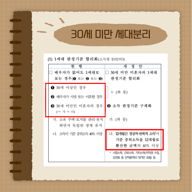 기존에는 30세 미만이 결혼을 하지 않았음에도 배우자 사망했거나 이혼한 경우, 독립된 생계를 유지하며 소득이 기준 40% 이상인 경우 세대 분리로 보는 경우가 있었습니다.