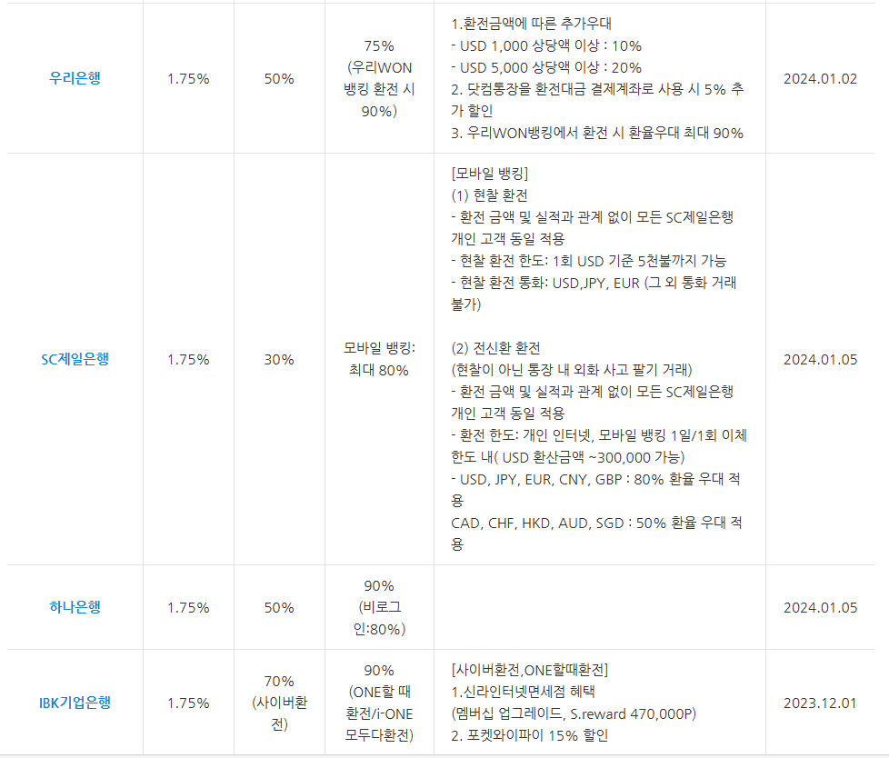 보통 은행들의 수수료는 1.75%입니다. 환전 우대율을 각 은행마다 우대사항이 다르니 하나하나 비교해 봐야 합니다. 큰 금액을 환전하지 않을 거라면 환전 우대수수료 몇 %로는 큰 차이가 나지 않으니 환전 수수료 비교할 때 드는 시간과 에너지 소비를 줄이는 것도 좋은 선택이라고 생각합니다. ^^